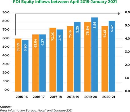 According to the Department for Promotion of Industry and Internal Trade (DPIIT), foreign direct investment (FDI) equity inflows to India reached US$ 72.12 billion in 2020-21 (until January 2021) while the cumulative FDI equity inflows to the country from April 2000 to January 2021 reached US$ 545.0 billion.