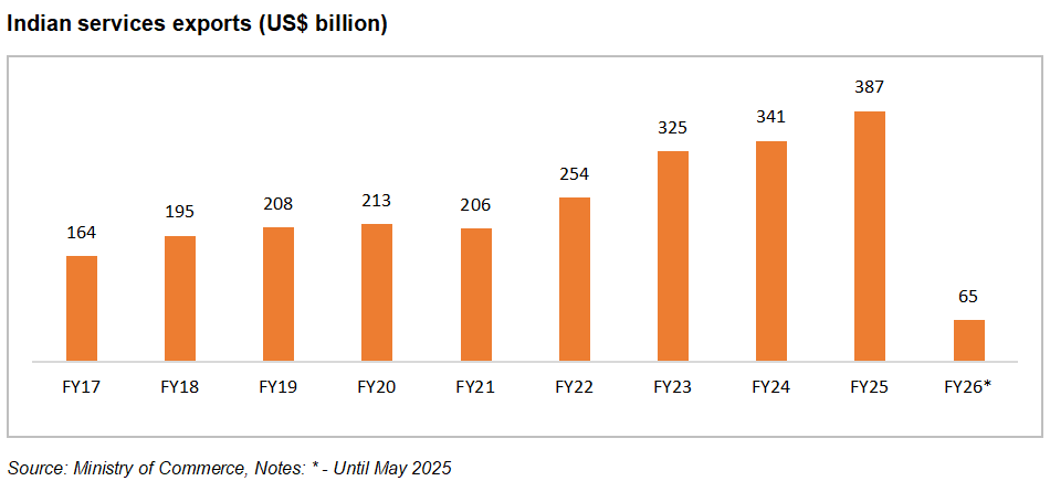 The robust GDP growth in FY26 (April-June 2025) was primarily driven by the services sector, which expanded 9.3%. All key components, trade, hotels, transport, communication, broadcasting-related services, financial, real estate and professional services, as well as public administration, defence, and other services, demonstrated strong upward momentum, significantly contributing to the overall economic expansion. Overall, job creation in the Services sector has increased to 36% in the last decade.